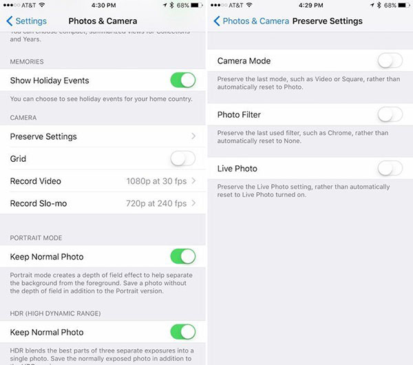 相機設置:在相機設置中,蘋果增加了“保留”設置。打開“相機模式”的開關,系統將為你保留上次拍照時使用的模式,如“視頻”或“正方形”,而非自動重設為“照片”。而打開“照片濾鏡”的開關的話,系統將會為你保留上次使用的濾鏡,如銘黃,而非自動重設為“無”。