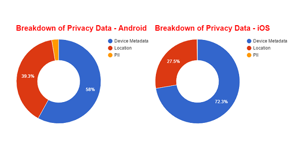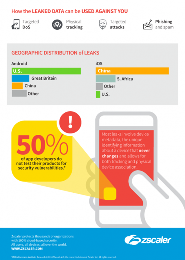 通過分析受自家安全產品保護的設備的事務處理狀況,Zscaler發現iOS應用程序比Android apps洩露了用戶更多的隱私信息。人們常以為iOS要比Android更加安全,但根據Zscaler上季度從4500萬起事務中檢測到的數據,發現其中有大約20萬起涉及被app洩露了用戶數據,包括PII級別的個人身份信息(比如手機號碼和電子郵件地址)、地理位置信息(經緯度坐標)、設備元數據(IMEI碼 / MAC地址 / IMSI碼 / 網絡 / 操作系統 / SIM卡信息 / 制造商)等。