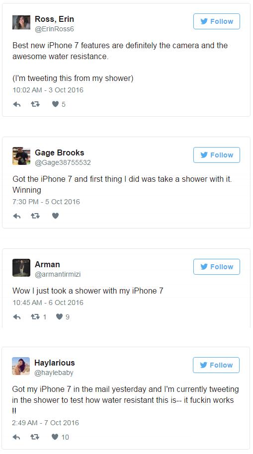 另據外媒Gizmodo報道,iPhone 7用戶間還出現了一種看似荒唐但並不令人驚訝的新趨勢:在洗澡時使用這款設備,並社交媒體上分享測試結果。