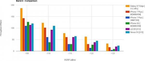 測試的方法是從最強的 LTE 信號 -85dBm 開始 ,並逐步降低功率,模擬與信號塔的距離越來越遠。測試的 LTE 頻段包括:頻段12、頻段4和頻段7,這三個是美國最常見的三種 LTE 頻段。