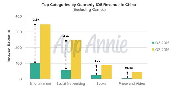 據悉,在未來一段時間裡,我國的App Store收入還會不斷增加,而新的增長點很可能出現在視頻流媒體服務身上。隨著消費行為的成熟,那些非游戲類別收入的份額將會不斷增大。在我國,非游戲類別的應用主要由娛樂,社交網絡,書籍,照片,和視頻流媒體等領銜,而這些類別今年的收入增加了三倍。