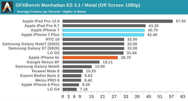 從2007年開始,蘋果就與Imagination Technologies合作為自家手機提供GPU授權支持。在今年最新的A10處理器上(可能用的是PowerVR GT7600定制增強版),GFXBench曼哈頓離屏項目比6S性能猛增50%,甩開骁龍820 30%以上。