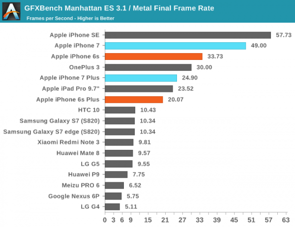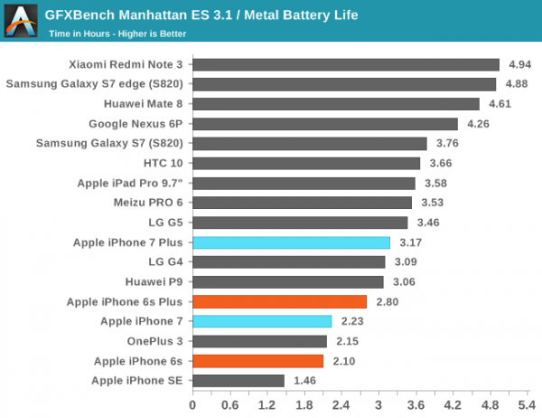 根據AnandTech的測試數據顯示,iPhone7/7 Plus在WiFi環境下連續上網的時間分別為9.22和9.32小時,在LTE環境下連續上網時間為8.62和9.02小時,GFXBench的續航測試時間分別為2.23和3.17小時。