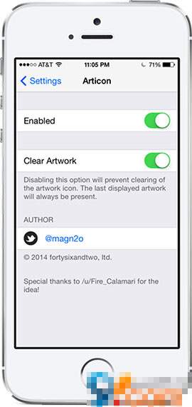 安裝完成後,進入【設置】→【Articon】進行相關設定,你只需要開啟開關並設置是否清除最後一次播放的專輯圖片。