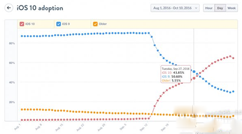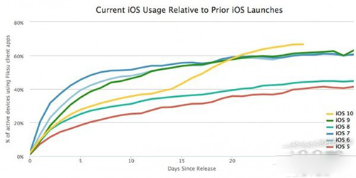根據Fiksu的數據,iOS 10現在的安裝普及率已經達到了66.7%,這也意味著有三分之二的活躍iOS設備完成了升級。iOS 10 發布到現在剛剛過去了27天,iOS 10當之無愧的成為普及速度最快的iOS版本。有趣的是,iOS 10最初的安裝普及率速度落後於iOS 6、7和9。不過在9月末時,iOS 10的安裝普及率增長速度瞬間爆炸。iOS 10發布前夕,iOS 9的安裝普及率為88%。