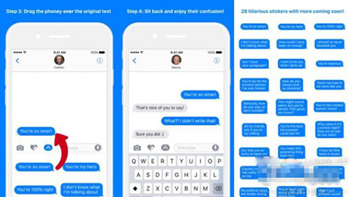 “Phoneys”包含一系列模仿蘋果標志性藍色聊天氣泡的表情。在iMessage中,這樣的聊天氣泡很常見。霍維爾表示,通過模仿iMessage聊天氣泡的設計,“Phoneys”幫用戶在他人的聊天信息中插入自己的話。