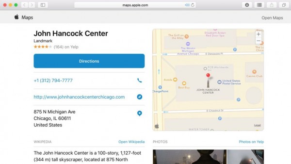 蘋果現在已經在其地圖數據庫中發布了可以顯示地標和信息點(POI)的公共網頁,該網站的鏈接可以顯示地點的一些細節,例如位置、名字、電話號碼和評價,值得一提的是,其設計也和iOS 10的地圖應用一樣。