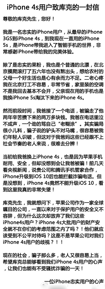 2016年9月23日,據爆料,一名果粉在微博上發布“致蘋果CEO庫克的一封信”,表達了對iOS 10放棄iPhone4s用戶的強烈不滿和抗議。蘋果秋季新品發布會之後,iOS10正式上線,但由於iPhone4s手機是蘋果5年前發布的機型,硬件配置較低,很遺憾與新系統“失之交臂”。