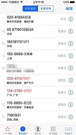 此前,iPhone用戶在面臨騷擾和詐騙電話時幾乎處於裸奔狀態,安裝騰訊手機管家之後,可以實現精准全面的防騷擾。當來電頁面顯示“詐騙電話”、“騷擾電話”(騰訊手機管家識別)時,用戶可以拒絕接聽,如遇到不想接的電話,可以直接加入黑名單,下次該號碼打過來時會自動攔截;無法辨別陌生來電的安全性時,可以查詢該號碼的歸屬地、類型和多少人標記等信息。