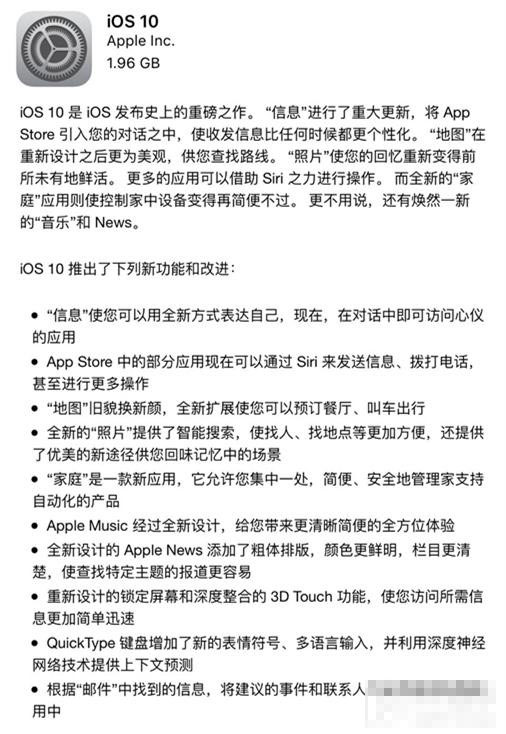 在這次更新中,蘋果並沒有提及GM版相對於之前的開發者版本有何不同,而是綜述了iOS10的大改進。包括全新的信息應用、重新設計的地圖應用,重新設計的鎖定屏幕和深度整合的3D Touch等功能。