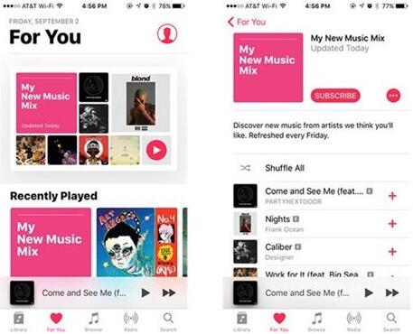在音樂應用中的“為你推薦”板塊中,My New Music Mix每周五會根據用戶的喜好來提供25首歌曲,根據Apple Music的全球營銷主管Bozoma Saint John表示,這一功能可以讓用戶在Apple Music龐大的曲庫中發現到新的歌手和音樂。