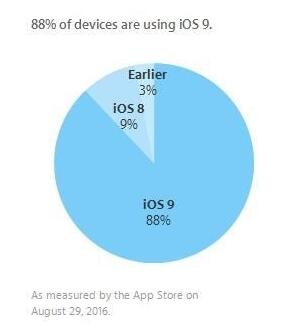 再過幾天,蘋果的新一代 iPhone發布會就要來了,按照傳統,新一代移動操作系統的推送時間也會在這一場發布會上宣布,在此之前,上一代系統的增長勢頭仍在繼續。我們通過蘋果官網的開發者頁面了解到,目前iOS 9的安裝率已經上漲至88%,相比上一次統計7月18日上漲了兩個百分點。
