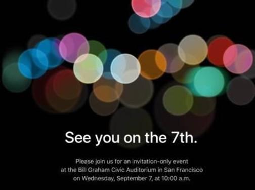 根據蘋果發出的邀請函,新品iPhone將於當地時間9月7日上午10點在舊金山發布,和此前的歷屆發布會一樣,iPhone的邀請函向來喜歡打謎語,據媒體們猜測,“See you on the 7th.”除了代表iPhone 7之外,新一代Apple Watch和MacBook Pro可能也會亮相。