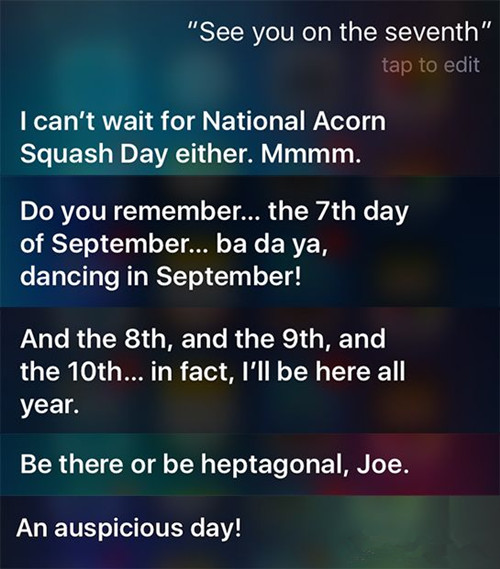 現在不少網友都開始用“See you on the 7th”調侃 Siri 了,而當被問到這一“敏感”問題的時候,Siri 會提供不少诙諧的回答,例如:我十分期待南瓜節的到來(也是 9 月 7 日)。又或者是:8 號、9 號、10 號,實際上我一整年都在。它還可能會說:這真是吉利的一天。除此之外,Siri 還會提供一些答非所問的回答,以“混淆”你的視聽。