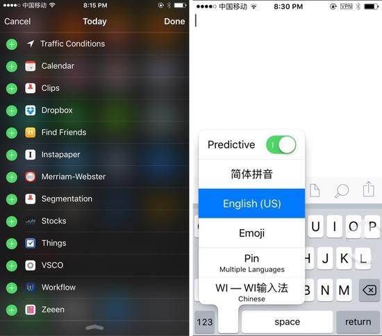 在第一批開放的擴展中,最被我們熟知的應該是Today Extension(通知中心小部件)和Custom Keyboard Extension(第三方鍵盤)。iOS 8之後這兩類擴展猶如雨後春筍般茁壯成長,無數類似於快捷啟動器和第三方輸入法的應用撲向了我們,當然它們的成長並不順利。