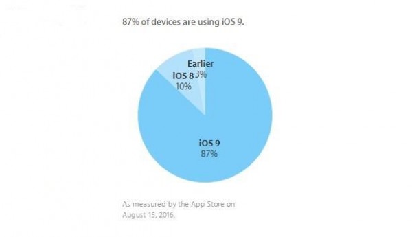 iOS 10已經完成了第六個開發者版本的測試(公共測試版則是第五個),但是蘋果還沒有公布相關的安裝率數據,而在iOS 10測試期間,iOS 9的安裝率仍然在上漲。威鋒網通過蘋果官網的開發者支持頁面了解到,截至8月15日,iOS 9的安裝率已經達到87%。蘋果上一次公布iOS 9安裝率是在7月18日,當時的數據是86%。