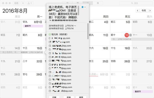 有人認為是自己的 Apple ID 被盜或者中了病毒,實際上,這事可能沒這麼邪乎。我和朋友進行了一場模擬試驗。已知朋友的 Apple ID 的關聯郵箱,我在日歷上新建一個事件,發送邀請給朋友的關聯郵箱,標題和地址都可以修改成自己想要的廣告內容,蘋果日歷的標題不限制字數,於是有了下面如此誇張的效果。而設置好邀請事件的時間段(比如上午7:00——下午9:00),在日歷上便會占據一天的可見范圍。