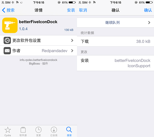 ①在Cydia中,搜索BetterFiveIconDock,並安裝該插件。