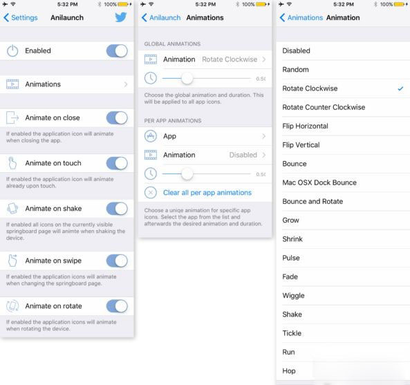 Anilaunch可以讓你主屏幕的應用圖標以各種方式“動起來”,如果你擔心這類動畫插件會是耗電大戶的話,那麼你完全無需擔心,因為據用戶測試Anilaunch並不會大量消耗設備的電量,而你也可以通過自定義設置來避免過多動畫的出現。
