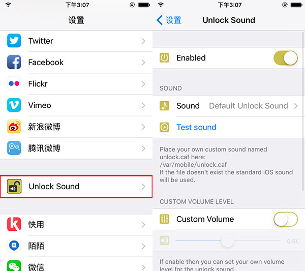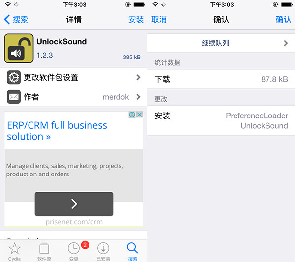 ①在Cydia中,搜索UnlockSound,並安裝該插件。