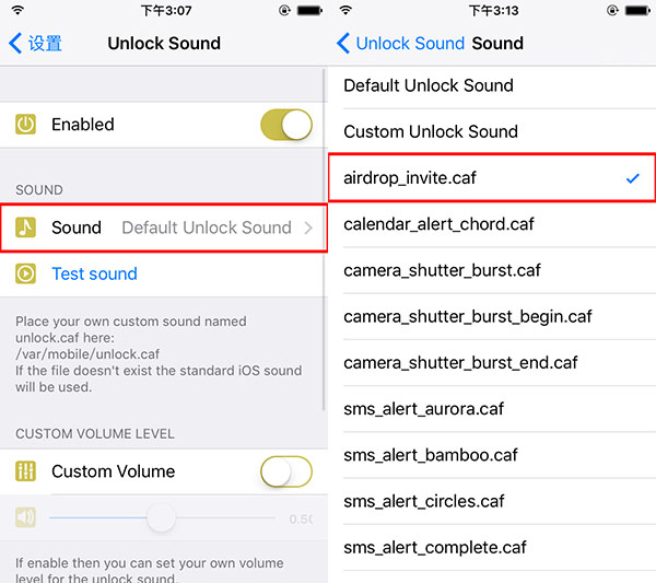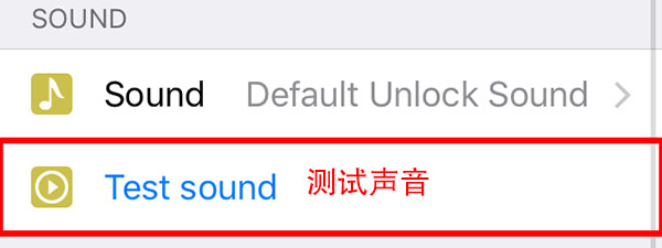 ③點擊【Sound】打開聲音列表,並選擇解鎖聲音(第一個是默認的解鎖聲音,第二個是自定義解鎖聲音)。
