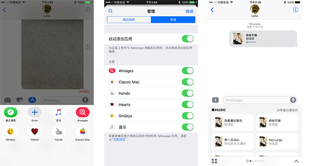 支持iMessage的APP隱藏在輸入框左側的按鍵,蘋果原生支持Apple music,用戶可以快速分享最近播放的Apple music音樂。