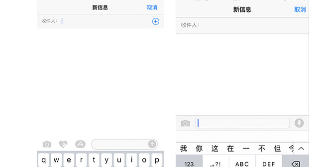 iOS 10的iMessage並未對UI進行太多的改動,在發信息的界面我們看到多了兩個功能按鍵,和一個發送箭頭。初次接觸iOS 10的用戶可能會一頭霧水,明明發布會上演示了很多功能,都藏在哪裡呢?別著急,我們待會揭曉。