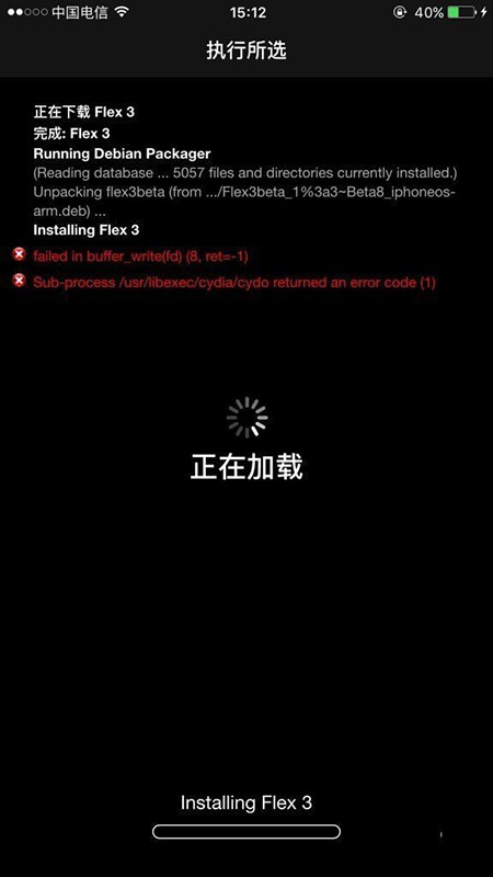 若越獄時,會提示紅字: “failed in buffer_write(fd)(8, ret=-1)” 安裝失敗。