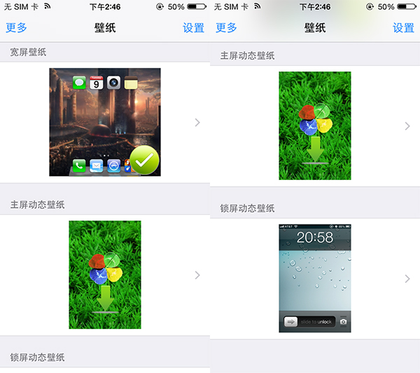 LiveWallpaper是一款動態壁紙美化插件,安裝之後,這款插件默認為用戶主屏幕設置滾動壁紙,如果用戶主屏幕的頁數不夠多的話,那麼效果可能不是那麼明顯,用戶可以將照片流或者相機膠卷中的任何一張圖片設置成壁紙。