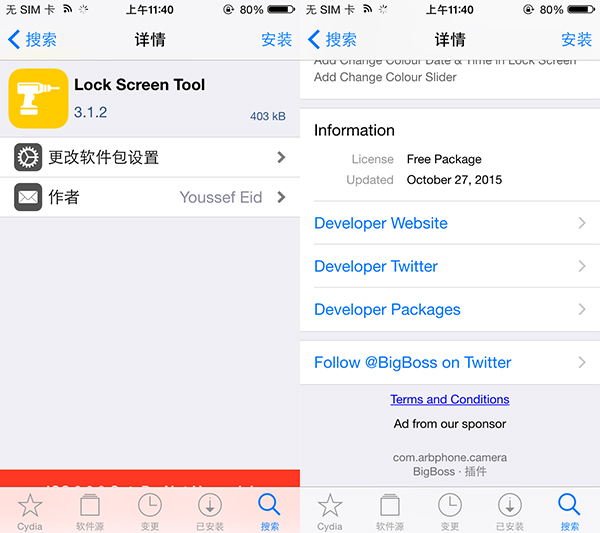 ①添加BigBoss源後,搜索Lock Screen Tool,並安裝該插件。