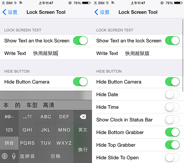 Lock Screen Tool是一款可以自定義滑動解鎖文字的插件,而且它還能隱藏照相按鈕和解鎖屏日期時間,讓你鎖屏界面更加簡潔。目前,該插件已兼容iOS 8及以下系統,感興趣的小伙伴可以在BigBoss源中免費下載到該插件,越獄免費源大全。