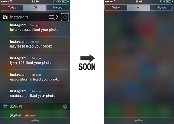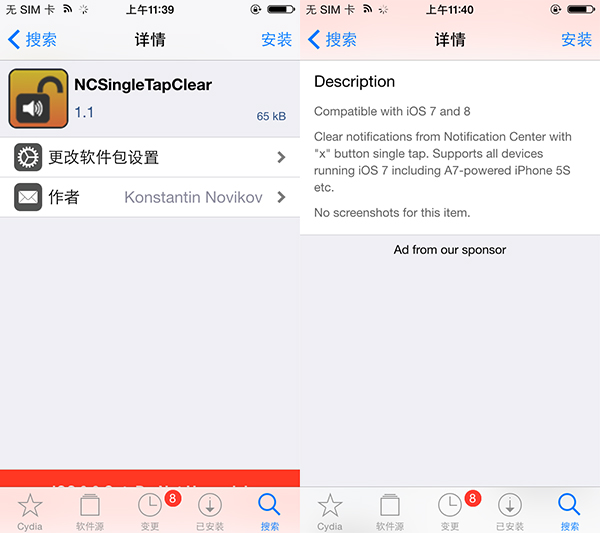 NCSingleTapClear是一款通知中心信息清除插件,將通知中心的“x”刪除鍵按2次清理推送減少至1次即可達到清理效果。