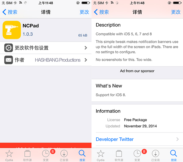 NCPad是一款可以讓你iPad上的推送橫幅寬度和設備寬度一樣的插件,安裝該插件之後,無需設置即可使用,收到推送後你會發現它的寬度增加,和你iPad設備一樣了。
