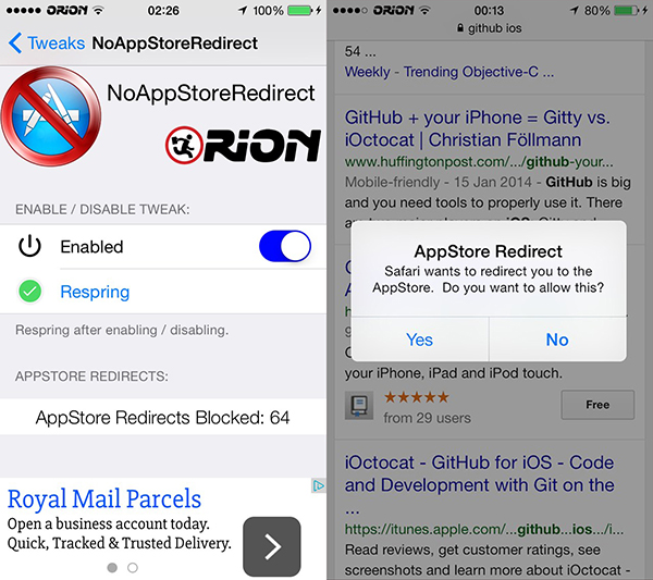 NoAppStoreRedirect是一款可以禁止應用跳轉至App Store的插件,安裝之後每次遇到自動轉向到App Store的所有鏈接時,都會跳出一個“再確認”的提示窗口,有效的使你避免這些鏈接!