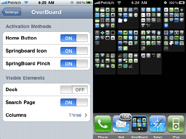 Overboard是一款可以將你的滑動分屏顯示變為單一界面顯示的插件,我們可以直接在主界面變為多分屏頁面顯示。我們可以在設置中定制我們的細節操作,比如我們可以選擇是否顯示DOCK,是否顯示動畫效果等等,非常的強大。
