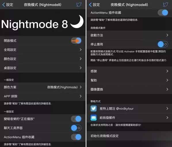 早在2014年的iOS8越獄中就有這麼一款插件NightMode8可以實現夜間風格,這是一款比Eclipse強大的多的插件,裡面的設置比Eclipse要多的多,不過當時這款插件是全英文版的,還需下載漢化文件來配合使用。