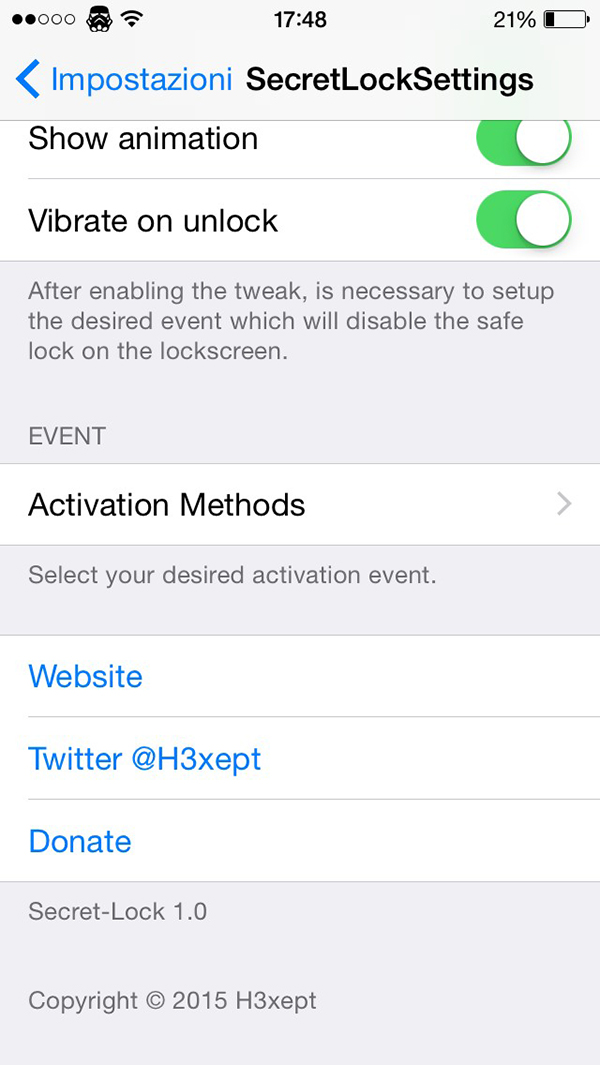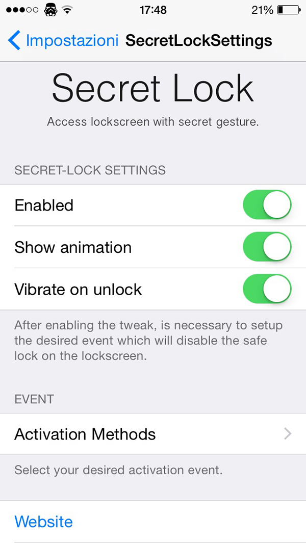 Secret-Lock是一款鎖屏增強插件。能夠將 iOS 鎖屏“封凍”起來,如果沒有 Activator 手勢,誰都無法讓屏幕“解凍”。這樣用戶就可以保護鎖屏安全,阻止任何人在屏幕上輕掃或者調出控制中心或通知中心。用戶必須設定好可以在鎖屏上使用的 Activator 手勢。設定完畢,設備進入鎖屏狀態之後,你就可以發現鎖屏完全動彈不得。用戶使用 Activator 手勢來解鎖就會看到自己設定的動畫。這樣方可以解鎖屏幕,輕掃調出通知中心或者控制中心。