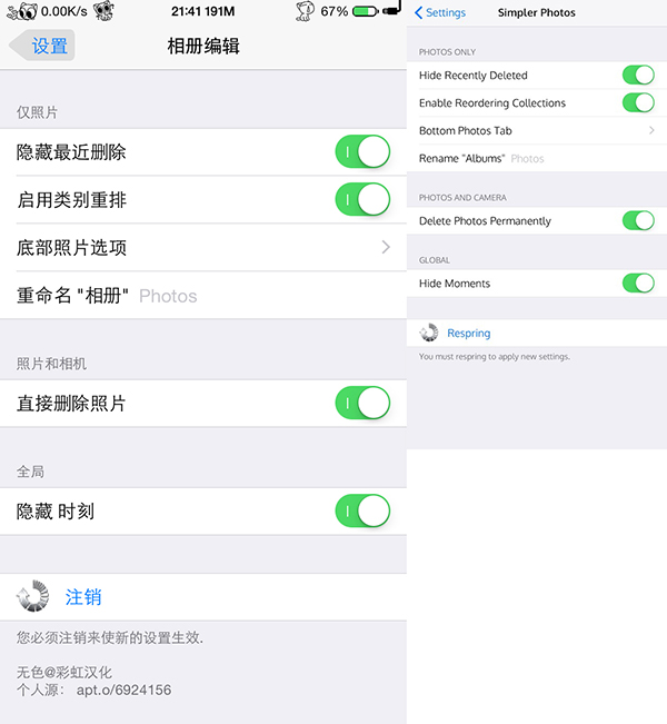 《Simpler Photos》可以讓用戶對照片App進行功能顯示自定義,可以調整的包括了隱藏照片中最近刪除相簿功能、隱藏照片底部共享、相簿切換按鈕功能、隱藏“照片”功能,只留下“相簿”功能、增加徹底刪除照片,不會被放到“最近刪除”功能、隱藏時間功能。目前已經更新支持iPad。