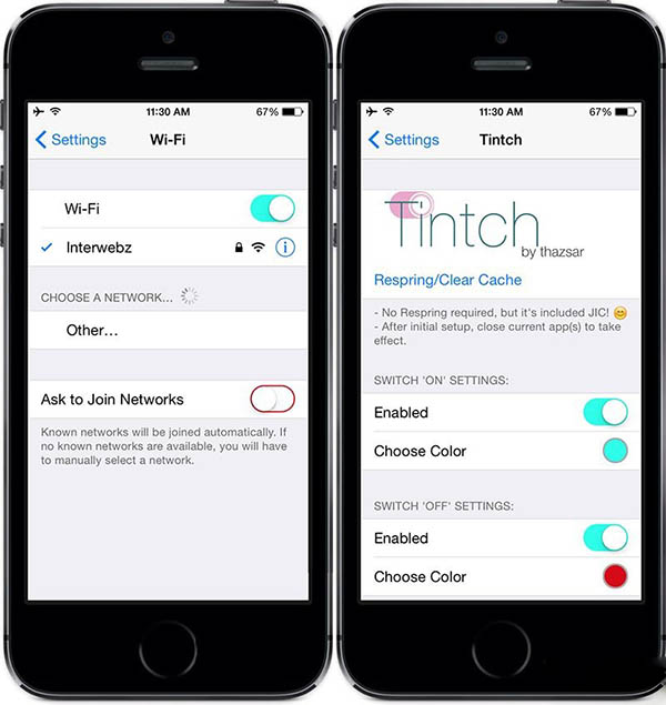 在iOS系統裡,無論你是在設置應用或者是在其它的一些應用裡都可以看到一些選項的開關(小圓點)。綠色代表打開了該開關,而關閉則是灰色。如果你認為這些顏色比較枯燥而又想作出改變的話,不妨試試這款名為Tintch的插件,它可以讓你對這些開關進行自定義顏色設置。