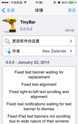 1.進入Cydia添加源http://Repo.alexzielenski.com,然後搜索【TinyBar】,點擊【安裝】。
