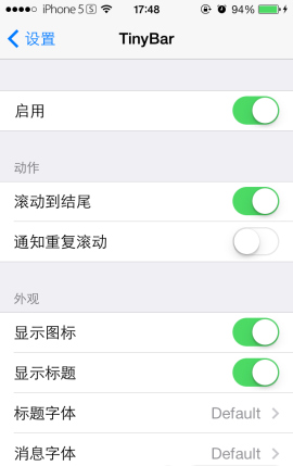 4.使用【TinyBar】默認的設置即可,你可以對通知字體進行設置,開啟重復滾動可加長橫幅顯示時間。
