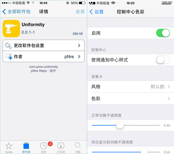 Uniformity 2是一款能自定義修改控制中心顏色的插件,已支持iOS 9及以下越獄系統,暫不支持iOS 9.1系統,有興趣的小伙伴可以http://repo.pnre.co/源中下載到該插件,點擊這裡查看更多越獄免費源大全。