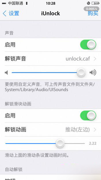若是說iUnlock,你可能不知道,要是說QuickDO,你是不是就知道了呢?沒錯,iUnlock與QuickDo來自同一位作者。這款插件雖然只有100多k,但是它的效果確實非常不錯。使用越獄插件 iUnlock 不僅可以定制解鎖動畫以及動畫時間,還可以修改解鎖聲音。