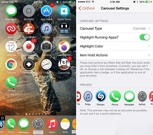 我們知道在原生系統下iOS設備的Dock欄只能夠放置4個應用圖標,並且沒有為用戶提供任何的自定義功能。不過如果你安裝了CirDock這款插件的話,就可以對Dock欄進行更多定制。