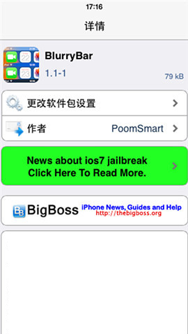 1.進入Cydia搜索【BlurryBar】,選擇上述源內插件點擊【安裝】。