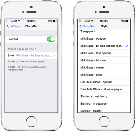 BlurryBar是一款簡單的美化插件,它可以讓你的設備狀態欄擁有虛化效果,更加符合ios7的系統特性,插件開發者說。