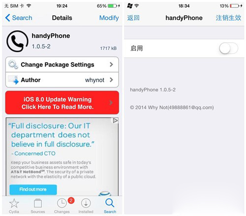 Handyphone插件為BigBoss自帶源所包含的,因此可以直接通過搜索框搜到,點擊打開該插件後直接點擊右上角的安裝(Install)按鈕直接安裝即可。