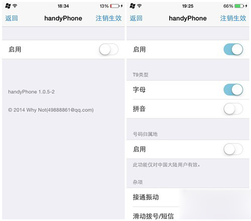 開啟插件的啟用按鈕後,即可顯示這款插件所包含的主要功能設置選項,主要包括:T9類型字母或拼音鍵盤選擇、號碼歸屬地顯示以及其他雜項。需要注意的是,當用戶根據需求確定後,需要設備注銷重啟方可生效。