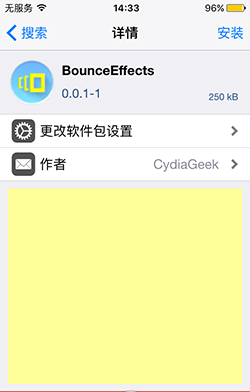 1、已越獄設備打開Cydia,搜索安裝BounceEffects插件。