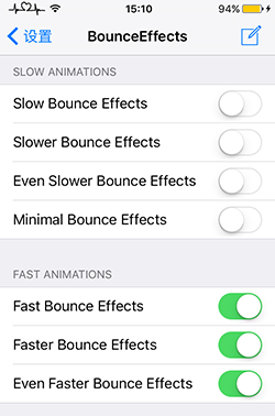2、進入設置,找到BounceEffects,該插件提供了【SLOW ANIMATIONS(緩慢動畫)】和【FAST ANIMATIONS(快速動畫)】選項,你可以根據自己的需求進行選擇,勾選之後點擊下方【Respring】重啟設備即可。